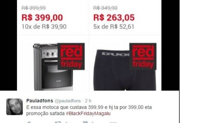 O evento, no entanto, atraiu não apenas comentários positivos, mas também críticas nas redes. Um usuário utilizou a hashtag da Magazine Luiza para comentar: “tudo pela metade do dobro. Só no Brasil!”. Uma outra internauta postou uma foto para criticar uma promoção das Lojas Americanas, que apresenta uma moto elétrica infantil que teve redução de apenas 0,99 centavos no preço. “E essa motoca que custava 399,99 e hj ta por 399,00 eta promoção safada”, comentou.