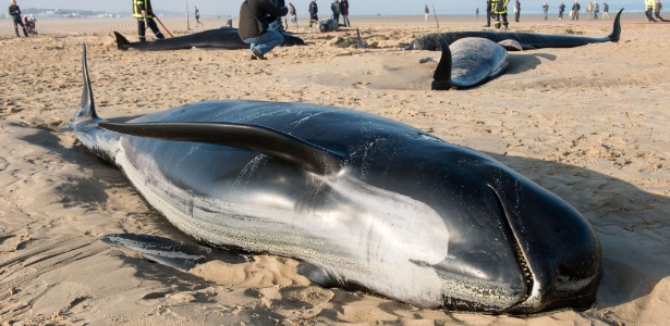 A dix baleines échoués groupe le lundi (2) sur la plage de Calais, nord de la France, et sept d'entre eux sont morts.