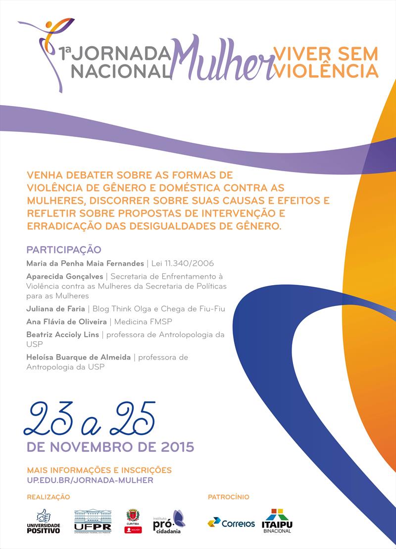Promovida pela Prefeitura de Curitiba, Universidade Positivo (UP), Universidade Federal do Paraná (UFPR) e Instituto Pró-Cidadania de Curitiba (IPPC), com patrocínio dos Correios e da Itaipu Binacional, além de contar com o apoio do Núcleo de Direitos Humanos da Pontifícia Universidade Católica do Paraná (PUC-PR), a jornada vai reunir estudantes, professores, gestores públicos, ativistas de ONGs e dos movimentos sociais de defesa dos direitos das mulheres, além de profissionais que atuam nas redes de proteção.